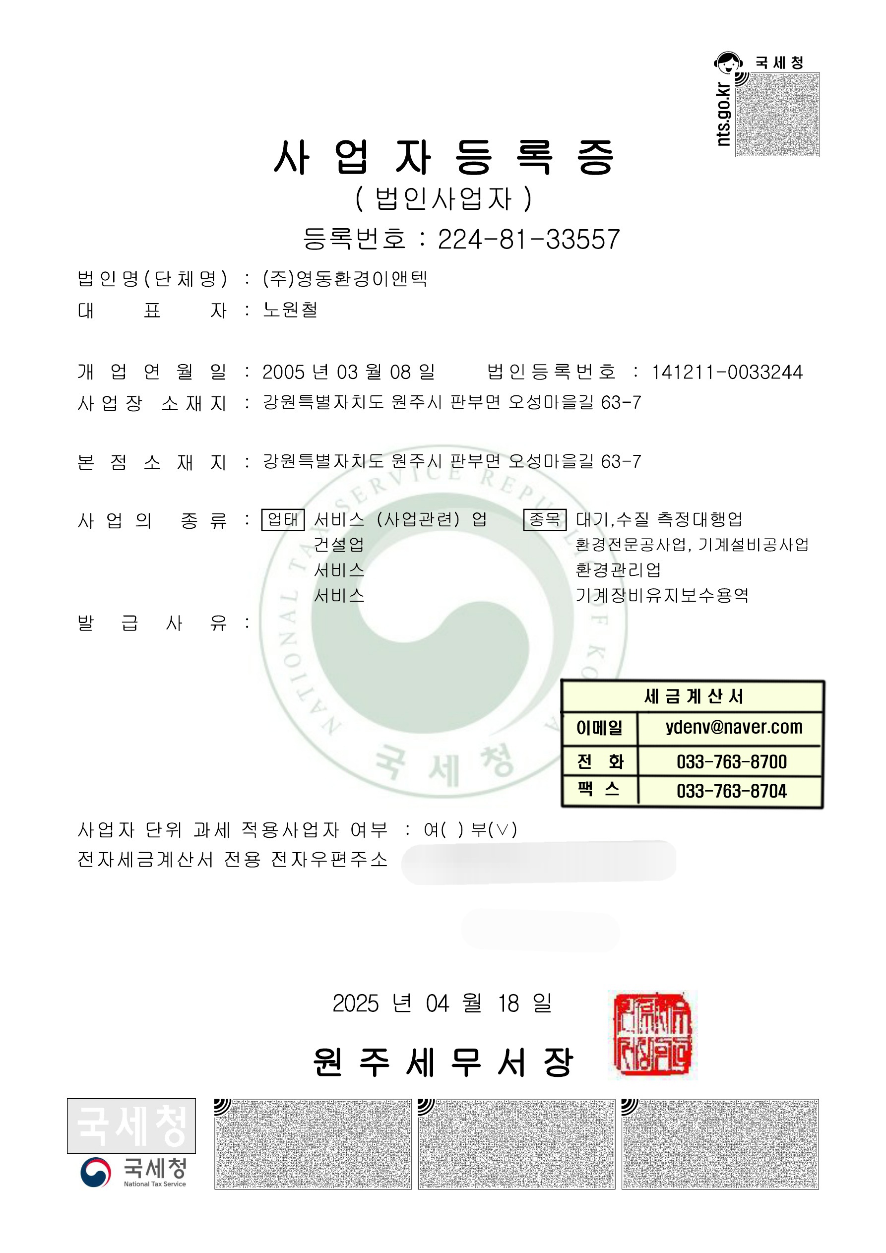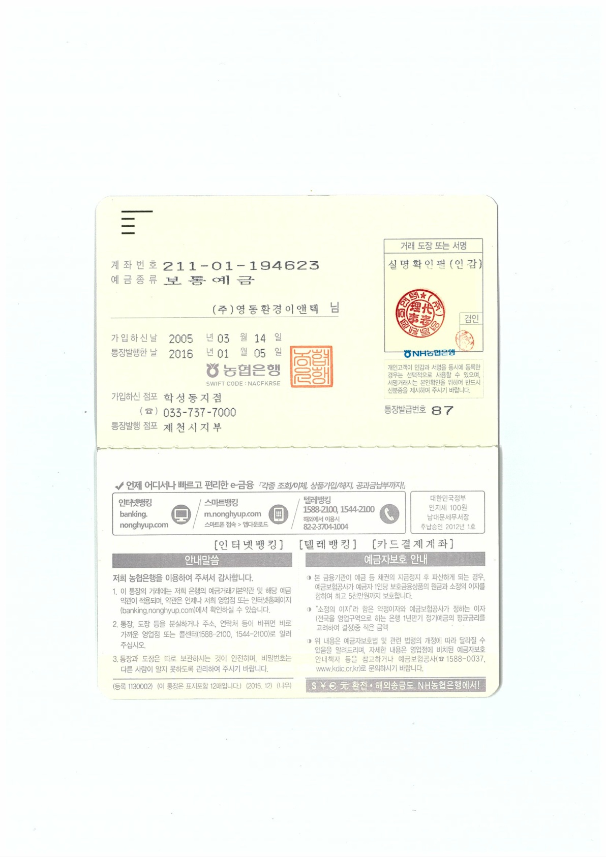 (주)영동환경이앤텍 사업자등록증 사본 및 통장사본입니다